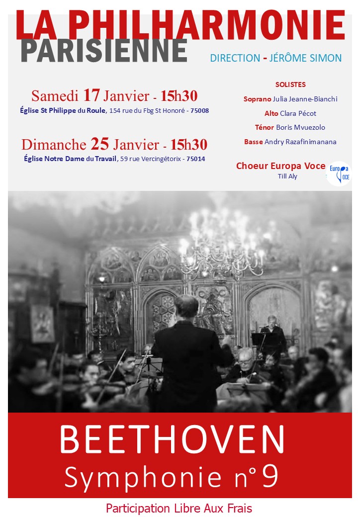 avec le Célèbre " Hymne à la Joie " chanté par le Choeur Europa Voce. Orchestre Symphonique : LA PHILHARMONIE PARISIENNE direction : Jérôme Simon Soprano : Julia Jeanne-Bianchi Alto : Clara Pécot Ténor : Boris Mvuezolo Basse : Andry Razafinimanana.