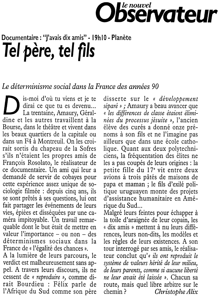 An informed study on the liberty of choice in French society in the nineties. "I filmed friends who accepted to take part in this event in order to speak about determinism. Everything seems to show that they have reproduced the standards inherited from their social class and their parents as though they hadn't had any freedom".